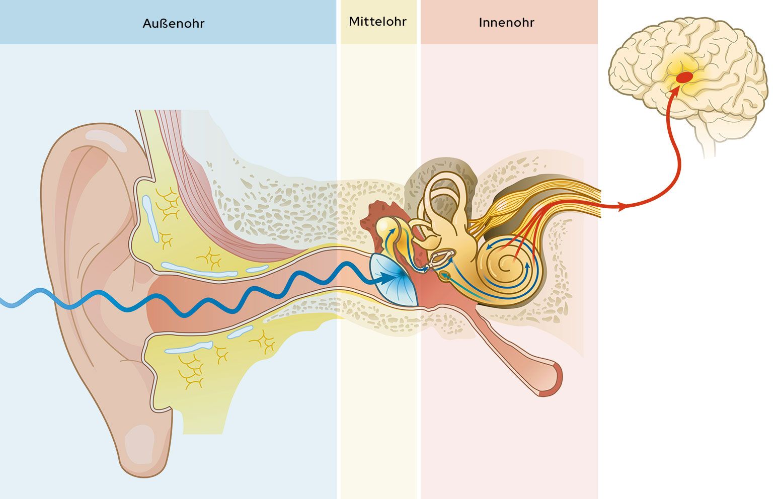 Das Außenohr besteht aus der Ohrmuschel und dem Gehörgang. Hier fängt alles an: Der Schall – also Geräusche – wird aufgefangen.